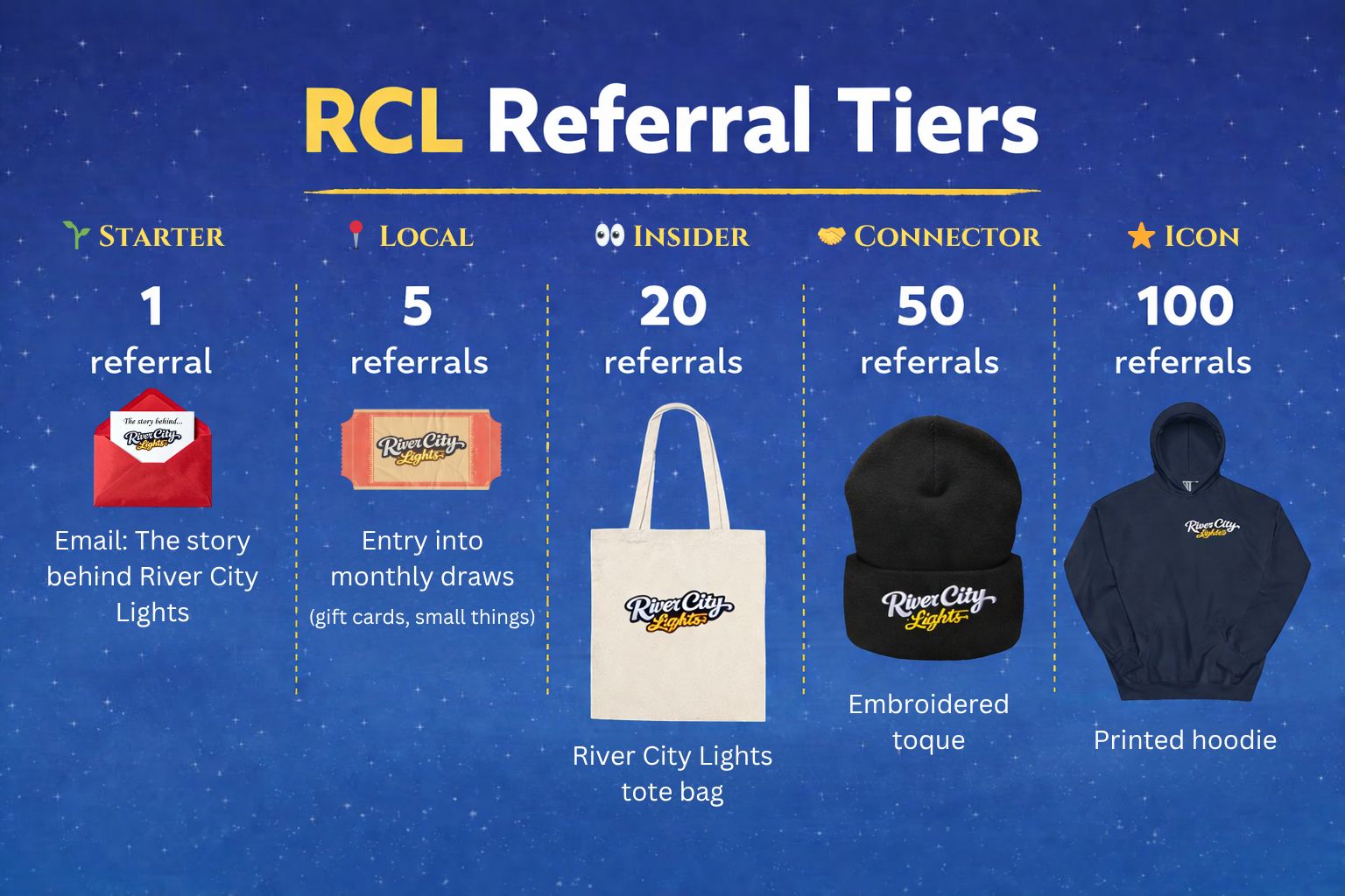 Kicking off this weekโs newsletter with a special announcementโweโre launching a referral program to reward you for spreading the word about River City Lights!