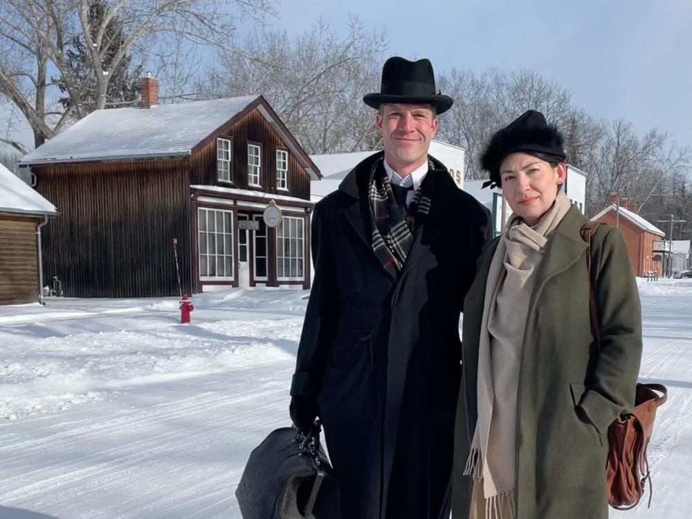 Patrick Lundeen and Emma Radford in Peggy & Balmer, a documentary that re-enacts the struggle faced to establish independent news media in Alberta by an Ontario couple, Peggy and Balmer Watt, who arrived in Edmonton in 1905. The film was made in 2025 by their grandson, Tom Radford, who also wrote a book the year prior about his grandparents.